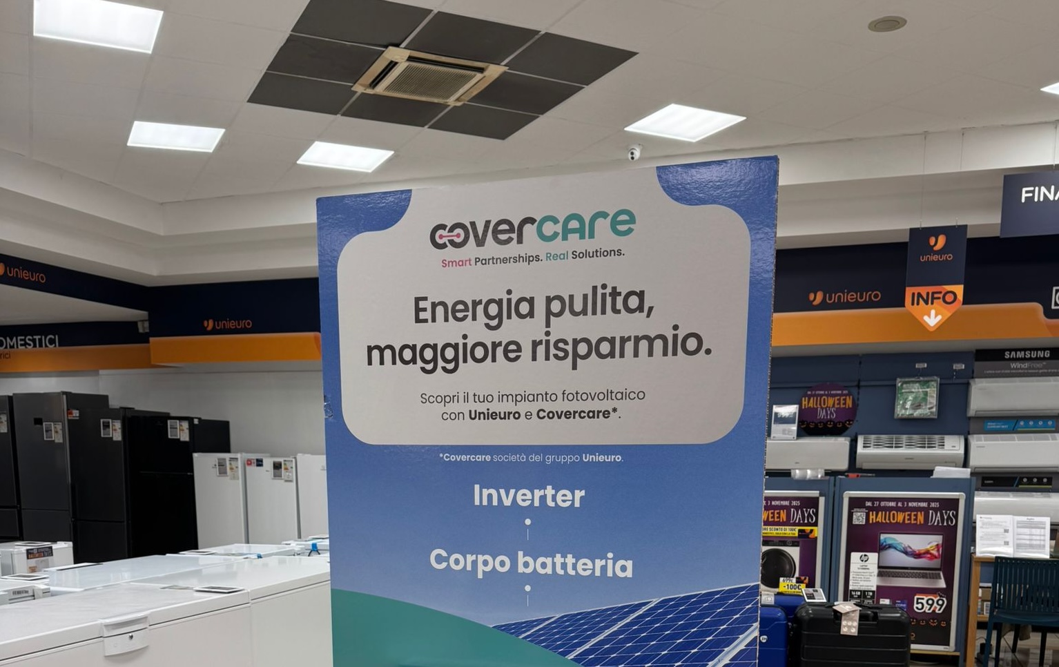Covercare introduce il fotovoltaico nei negozi Unieuro, in collaborazione con Elettrocasa Unieuro, per offrire ai clienti un percorso semplice e completo verso l’indipendenza energetica.